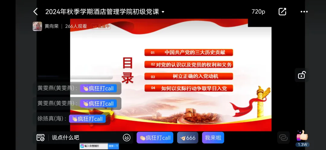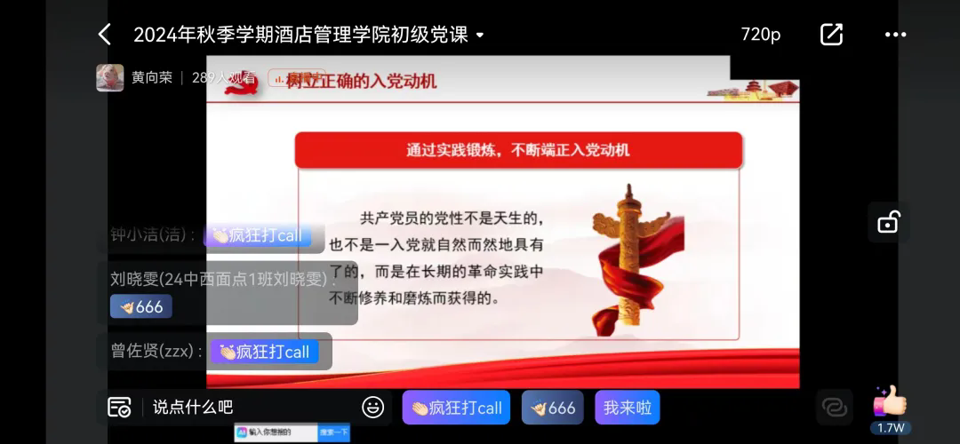 为加强青年大学生的党性教育,端正入党动机,引导他们建立正确的世界观、人生观和价值观,酒店管理学院直属党支部于9月23日中午在创新楼101顺利举行了2024年秋季学期初级党课的开班仪式暨党课第一讲,党校师资库陈金苗老师主讲,我院24级中西面点2、3班同学现场上课,其他学员则通过钉钉平台在线同步学习。
