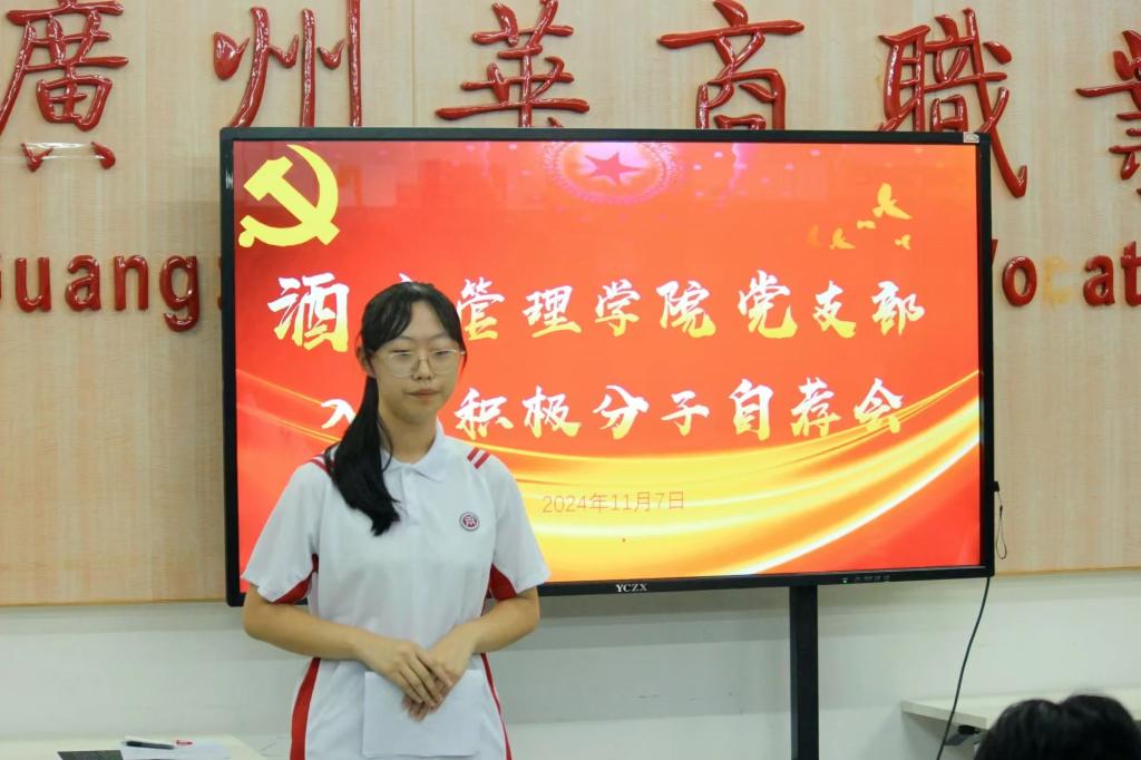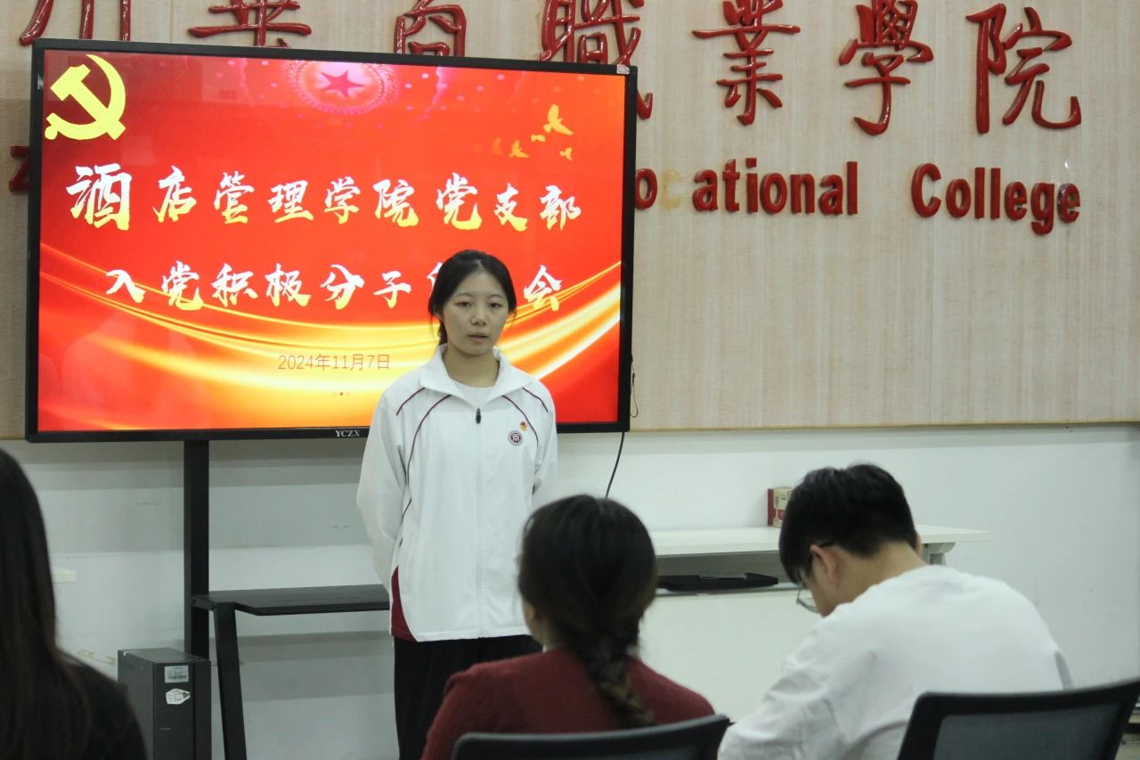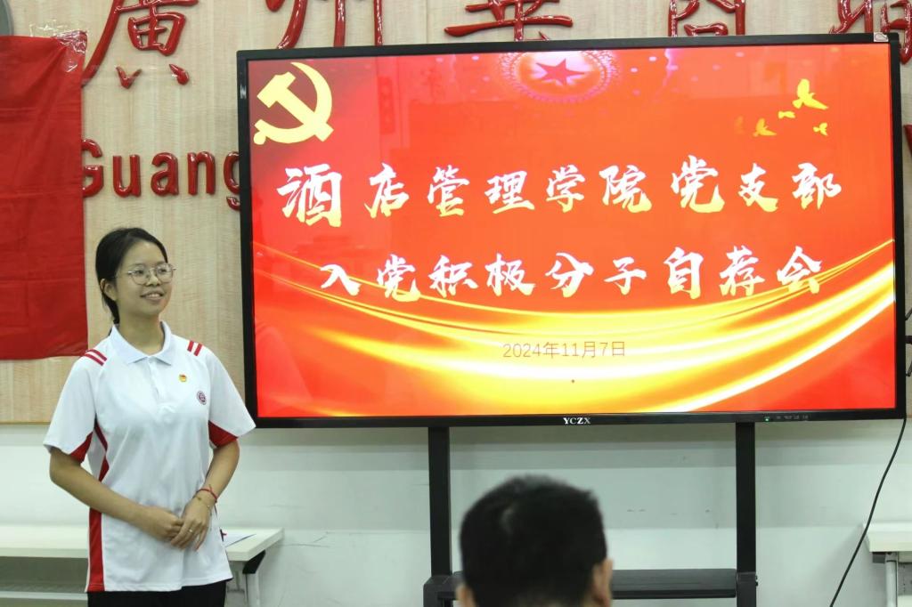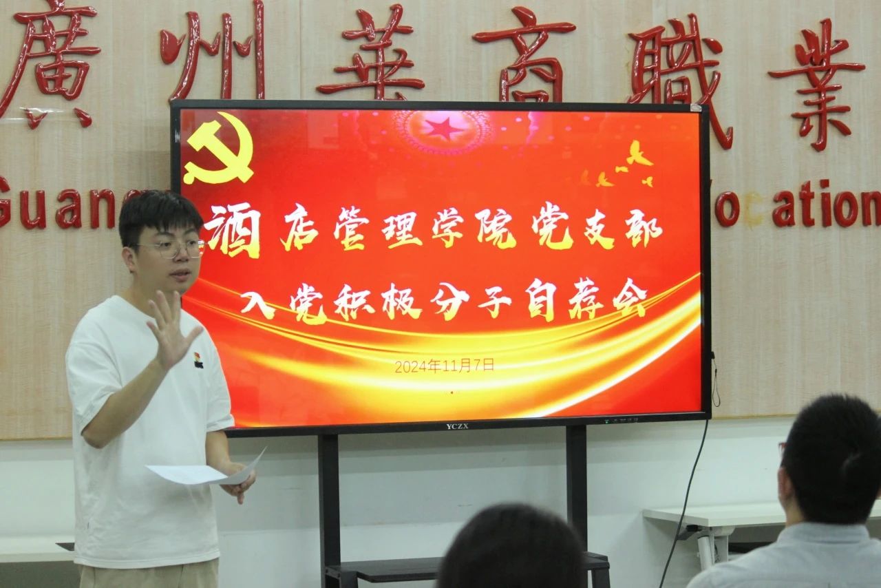为进一步做好入党积极分子培养教育工作,加强党的基层组织建设,酒店管理学院于11月7日晚,在创实301召开了2024年秋季学期入党积极分子自荐会。我院党支部师生党员代表,以及12名入党积极分子参加了自荐汇报,会议由党支部组织委员黄向荣老师主持。