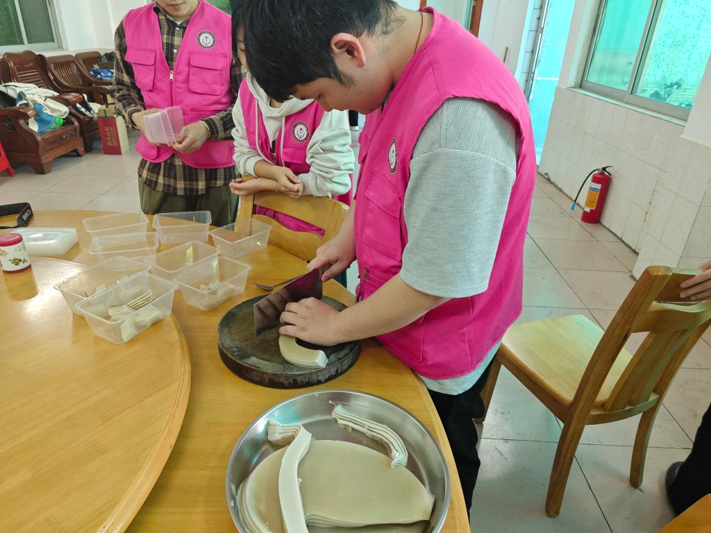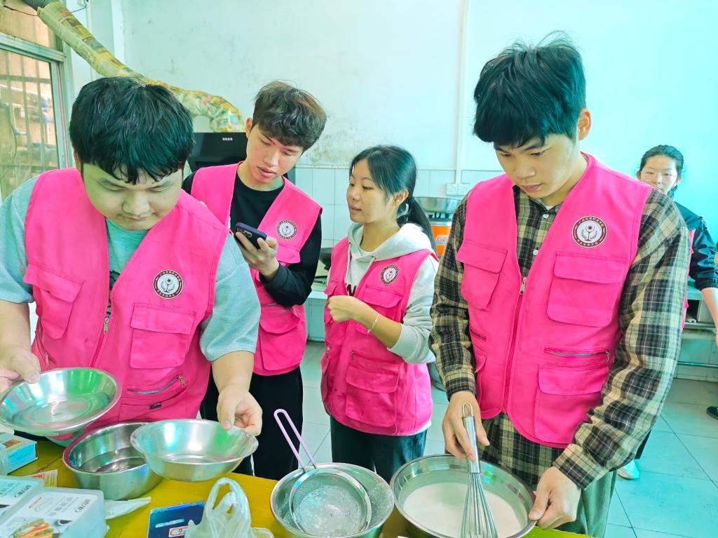 活动现场,大学生志愿者们在坭紫村活动中心迅速投入活动状态,个个化身成为面点小师傅,忙得热火朝天。他们有序分工,紧密合作,把所学的“中西面点工艺”“烹饪工艺与营养” 专业技能与社会实践活动充分结合,分工合作制作千层糕。从精准称量食材、细心搅拌面糊到耐心蒸制,每一步都饱含着对村民们的满满心意。不一会儿,香甜的气息弥漫开来,一盘盘金黄诱人的千层糕新鲜出炉。