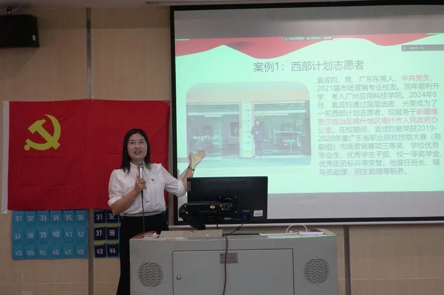 讲座伊始,陈金苗老师从中国共产党成立的历史切入,系统阐述了党“以人民为中心”的根本立场及革命、建设、改革时期的伟大成就。为让抽象理论具象化,课程特别引入三位优秀校友的实践案例:中共党员袁成钧作为2024届西部计划志愿者,服务新疆喀什基层;陈冠辞去导游职务,赴四川凉山支教并任校长;中共党员苏文贤以1195小时志愿服务、150小时救援及造血干细胞捐献诠释担当。