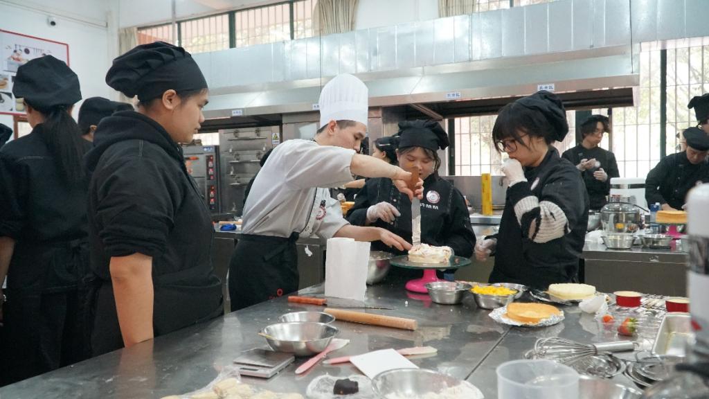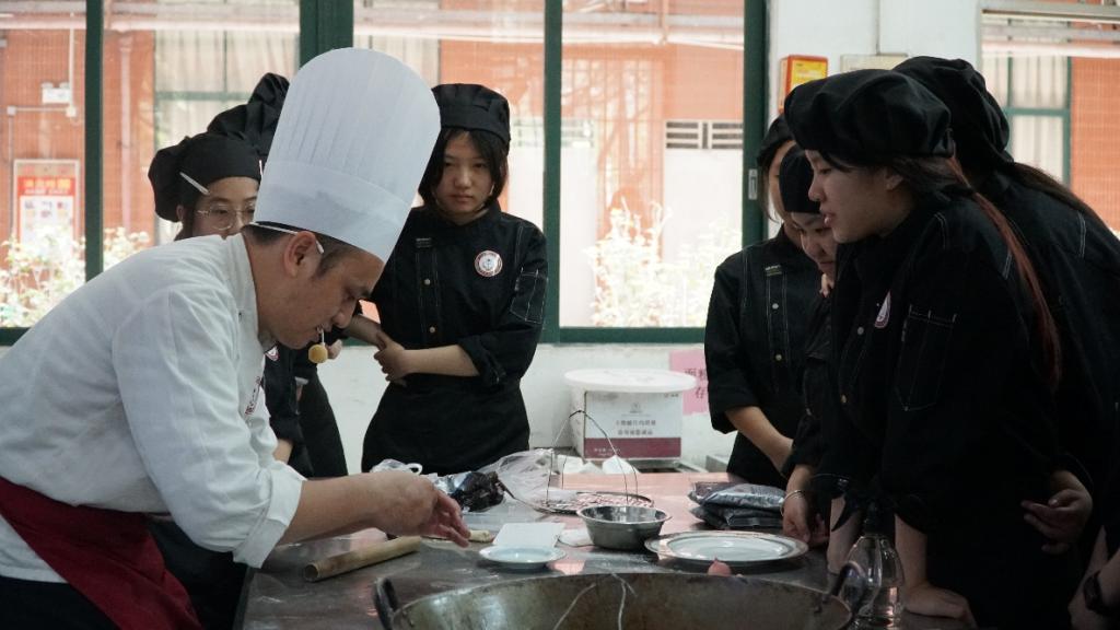 “蛋挞的荤酥讲究黄油与面粉的黄金配比,揉面时要顺着一个方向,还有蛋液的糖分控制很关键,烤到表面微焦时香味最浓,我教你们判断烘烤熟度的小技巧……”来自本地知名烘焙连锁企业的黄师傅,正手把手指导学生操作。本次课堂革命的一大亮点,便是建立“企业师傅+专任教师”双师教学团队,企业师傅带来最新的行业技术、生产标准和市场趋势,专任教师则负责梳理理论体系、衔接知识脉络,形成“实操指导+理论支撑”的教学闭环。