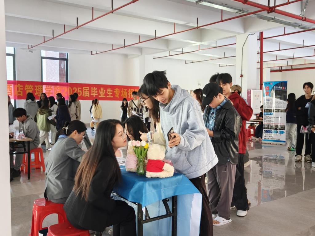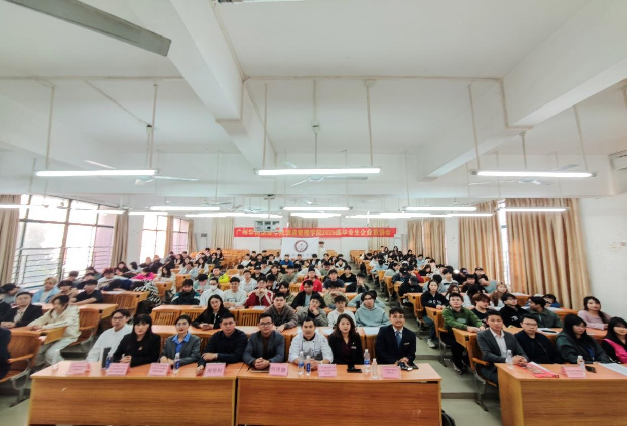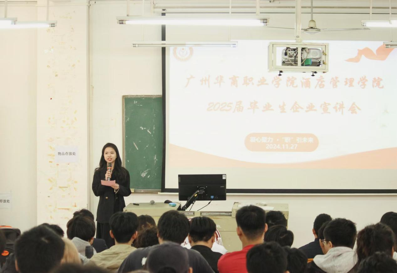 为促进高质量实习就业,共筑双赢未来,11月27日下午酒店管理学院在博C301顺利举行了主题为“凝心聚力·“职”引未来”的2025届毕业生企业宣讲会。10家知名企业的代表进校,为毕业生们解读企业文化优势、岗位详情与职业发展路径。酒店管理学院副院长何洪健、副院长谢锦权、辅导员以及全体2025届毕业生参加了活动。