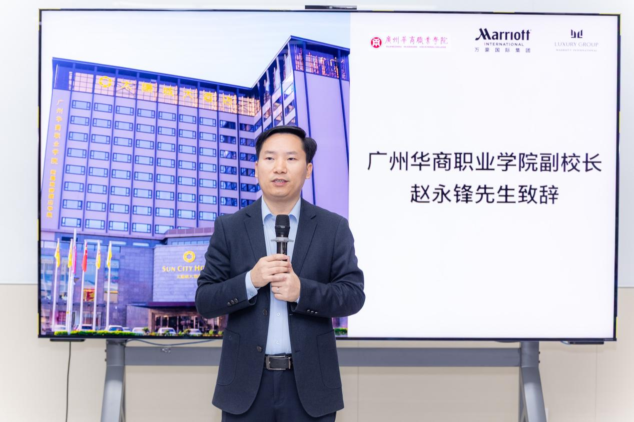 活动伊始,广州华商职业学院赵永锋副校长致辞。他对万豪国际集团大中华区奢华品牌的各位嘉宾表示热烈欢迎,对酒店管理与厨艺学院毕业班同学及英才班候选学子寄予殷切期望。他指出,万豪国际集团作为全球酒店业标杆,以卓越服务、文化底蕴和国际网络著称,此次校企深度合作,标志着我校在校企协同育人、深化产教融合方面又迈出了重要一步,为华职学子搭建通向国际顶尖酒店管理集团的桥梁,开辟更为多元的职业发展空间。