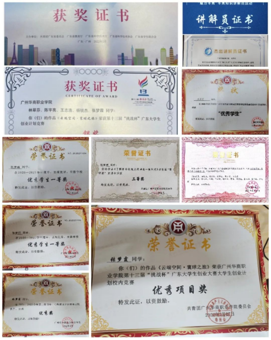在创新创业竞赛方面,先后获得第十三届“挑战杯”广东大学生创业计划竞赛省赛银奖、校赛最佳项目奖;第八届中国国际“互联网+”大学生创新创业大赛校赛决赛二等奖。在课余时间参加劳动手工比赛,并获得三等奖;参加第二届“阳光排舞进校园”并获得校级二等奖、最佳人气奖、“趣味运动会”啦啦操团体二等奖。