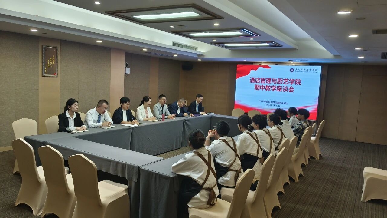 2025年11月17日,广州华商职业学院酒店管理与厨艺学院附属教学酒店——广州太阳城大酒店组织召开了“24烹饪2班期中座谈会”。会议由酒店管理与厨艺学院副院长谢锦权主持,酒店管理层、教师代表及学生代表共同参与,围绕实训教学、课程优化、场地设施等方面展开深入交流,进一步推动产教融合走实走深。
