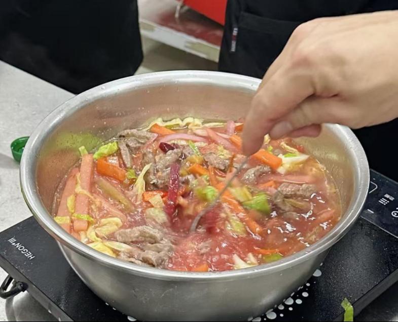 随着锅中香气逐渐浓郁,一锅锅色泽红亮、汤体醇厚的罗宋汤陆续完成。同学们细心装盘,缀以清新香菜,品尝亲手烹制的地道滋味。酸甜适口的汤液裹挟着牛肉的醇香与蔬菜的清甜,引得众人连连称赞。有学生表示:“这不仅是一道汤品的制作,更是一次对西餐烹饪逻辑的深度理解——原来正宗罗宋汤背后有如此严谨的工艺体系。”