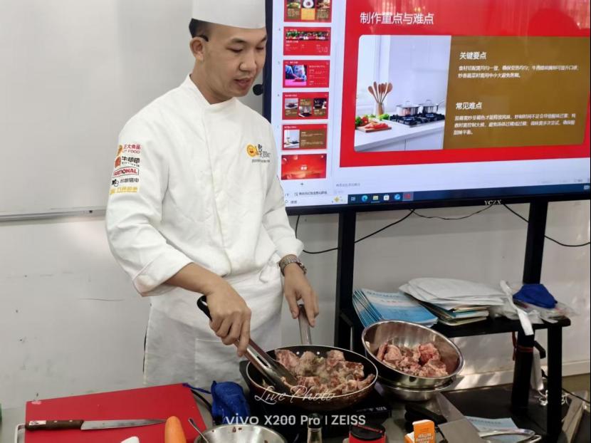 “罗宋汤的独特风味,源于食材的精准配比与烹饪节奏的细腻把控。”课堂伊始,吴老师系统讲解罗宋汤的历史源流与风味流派,深入解析从选材、预处理到调味逻辑的每一个关键环节。番茄需去皮炒制出鲜艳红油,奠定汤体酸甜基调;牛肉冷水下锅焯去血沫,锁住肉质软嫩;洋葱、胡萝卜与土豆等蔬菜切块均匀,确保同步熟透入味……老师逐步示范,将烹饪理论转化为可操作的细节指引,使学生在动手过程中理解每一道工序背后的科学原理。