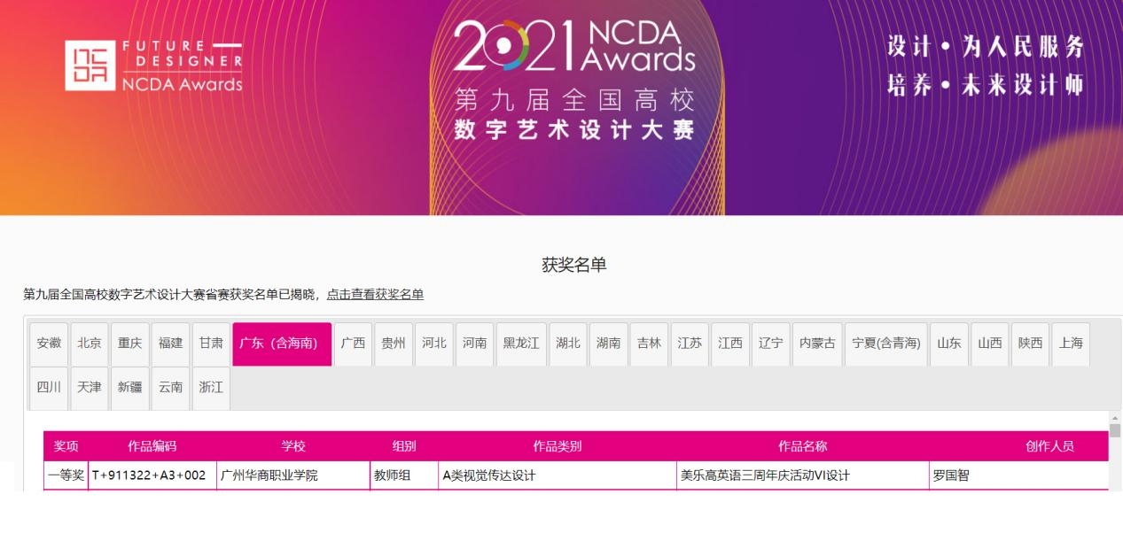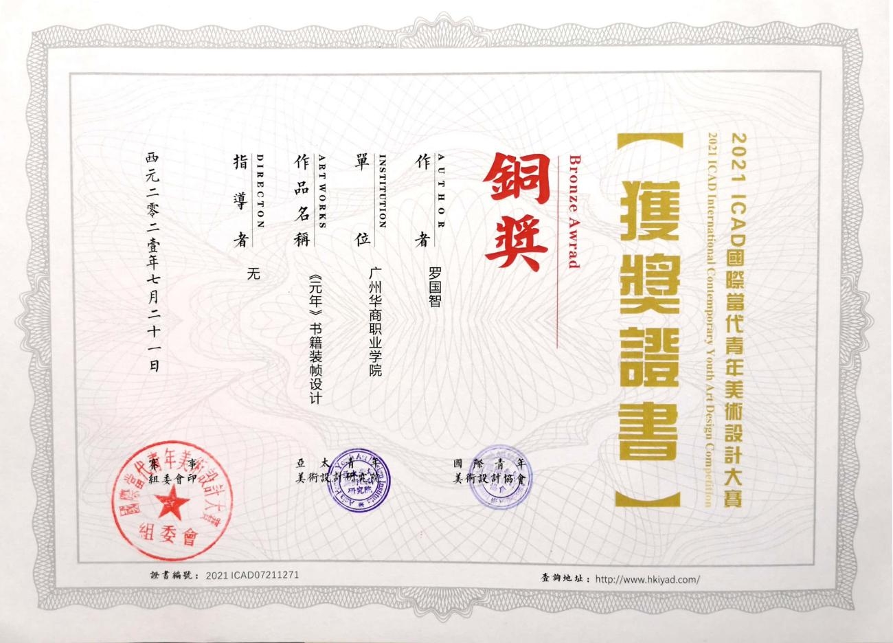 此外,罗国智老师在下企业实践期间主持的设计项目《美乐高英语三周年活动VI设计》参加2021年NCDA第九届全国高校数字艺术设计大赛,获得广东省(含海南)赛区一等奖,作品现已推选参加国赛;设计作品《< 元年>书籍装帧设计》获得2021年ICAD国际当代青年美术设计大赛铜奖。