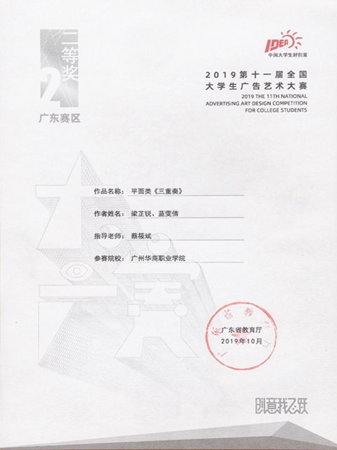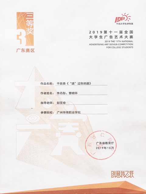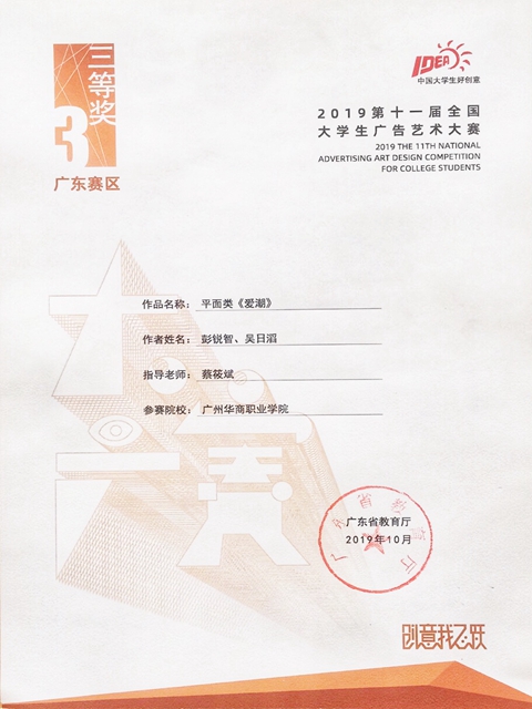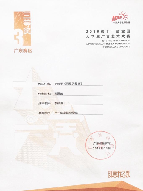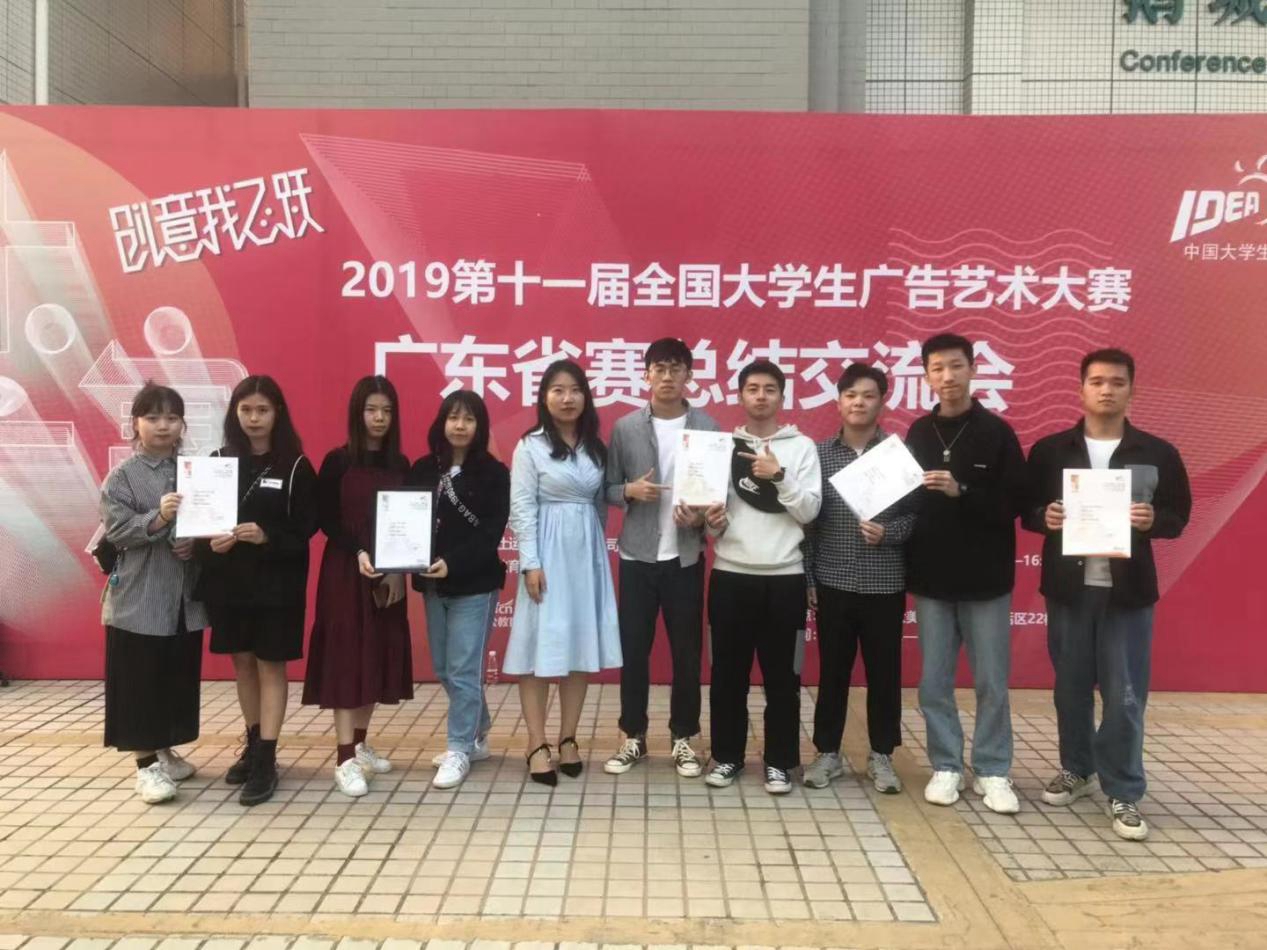 由广东省教育厅主办第十一届全国大学生广告艺术大赛广东省赛颁奖及总结交流活动在惠州学院举行,广东省参赛院校总数、参赛作品数量及质量较上届均有显著提升。本届赛事参赛院校数量首次破百,达105所,参赛院系171个,参赛作品件数破万。经过学界学者与业界专家通宵达旦的评审,所有作品经过严格甄选,并对有分歧的作品进行反复讨论后,最终只有17.5%的作品杀出重围,获得广东省赛各级奖项并被报送至北京代表广东赛区参加国赛的角逐。