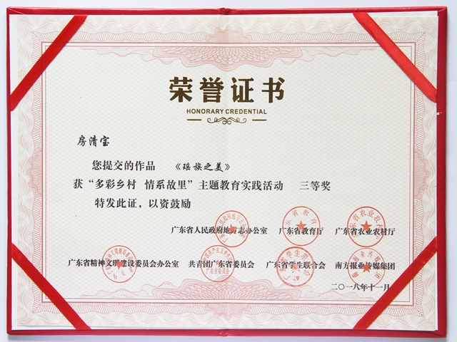 由广东省人民政府地方志办公室、广东省教育厅'广东省农业农村厅、广东省精神文明建设委员会办公室、共育团广东省委员会广东省学主联合会、南方报业传娱集团联合组织开展的“多彩乡村情系故里”主题教育实践活动(短视频大赛)中,我系师生在多所本科知名高校激烈角逐中,突出重围,由彭亚珍老师指导的17级艺术设计1班房清宝同学的作品《瑶族之美》微视频制作精良,排名靠前,排在39位,获得省级三等奖,该同学作为少数民族,利用自己的优势拍摄了清远本土瑶族的民生文化、地理人文等内容。我院也在这次活动中因为积极组织师生参与,荣获“优秀组织奖”。