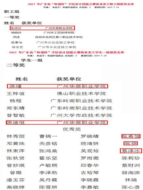 为了响应广东省人力资源和社会保障厅《关于报送2016年职业技能竞赛总结和2017年竞赛计划的通知》(粤人社函〔2015〕673号)文件精神,我院教师及学生积极参与了由广东省工业工会、广东省装饰职业技能鉴定所经研究举办的第七届“2017广东省‘和谐杯’手绘设计技能大赛”,经过数个月的激烈角逐,取得了优异的成绩。其中,我系彭亚珍老师在这次比赛中获得商业美工组(职工组)第一名,广东省排名第一,15级艺术设计1班的陈瑾、陈迪恒同学荣获学生组二等奖,15级艺术设计3班蔡泽冰、16级艺术设计1班的张凯和张希恒同学荣获学生组优秀奖。该次竞赛是全省所有高职院校都积极参与的大型专业的手绘比赛,由于我系师生在参赛前高度重视、积极参与、认真准备、用心付出,最终才能以优异的成绩,为我系及学校争光!