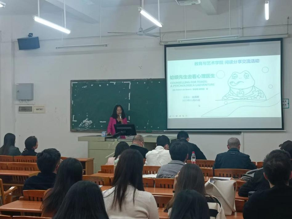 随后,赵景阁老师和陈展雄老师分别进行阅读分享,首先,赵景阁同志以《蛤蟆先生去看心理医生》这本书进行了分享。她结合当代人存在的心理问题,特别是作为教书育人的教师职业,围绕“压力、心理、成长、生命的意义”四个方面讲述阅读体会和心得感受,让我们了解到在教育工作中,建立良好的师生关系、促进学生的情感表达和及时理解他们的情感需求,并提供有效的支持和指导。