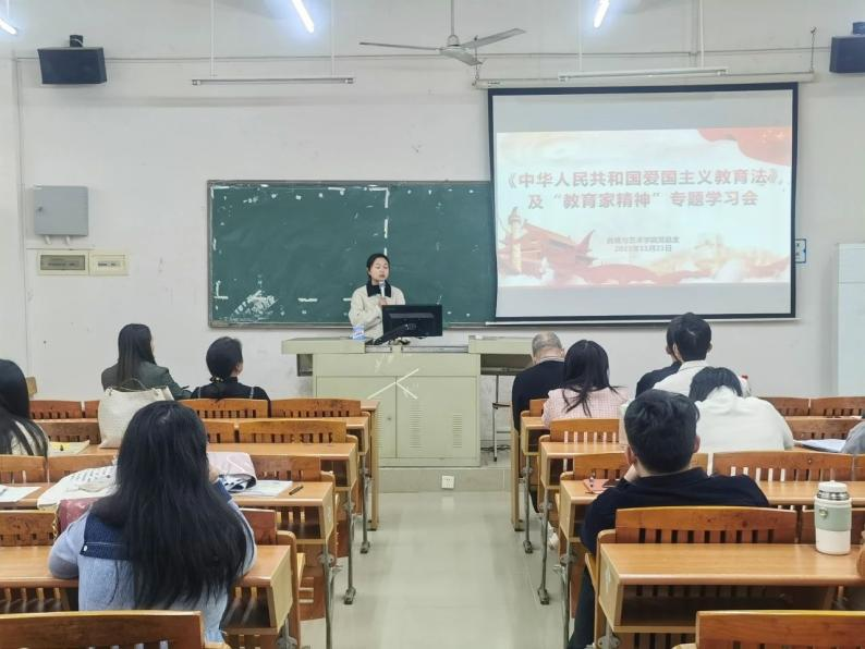 紧接着,刘玉娟院长作动员讲话。她强调,爱国主义不是抽象的,而是具体的,要根植于心、践履于行。此次专题学习,深化了对爱国主义精神、“教育家精神”的理解,希望各位老师以爱国主义教育法的颁布实施为契机,做爱国主义教育的先行者,将爱国主义教育法的基本要求、“教育家精神”深刻内涵与自身具体实际结合起来,立足工作岗位,涵养高尚师德,让爱国情、强国志、报国行在奋斗实践中升华,推动学院各项事业高质量发展。