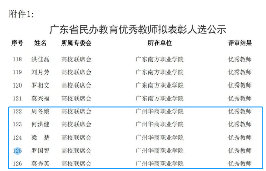 近日,广东省民办教育协会发文表彰2023年广东民办教育优秀教师和优秀校(园)长华商教育集团旗下院校广州华商学院、广州华商职业学院共有11位老师上榜,我院罗国智老师荣获广东民办优秀教师称号,这一荣誉不仅是对罗老师个人教学成果的肯定,也是对我院的再次认可。