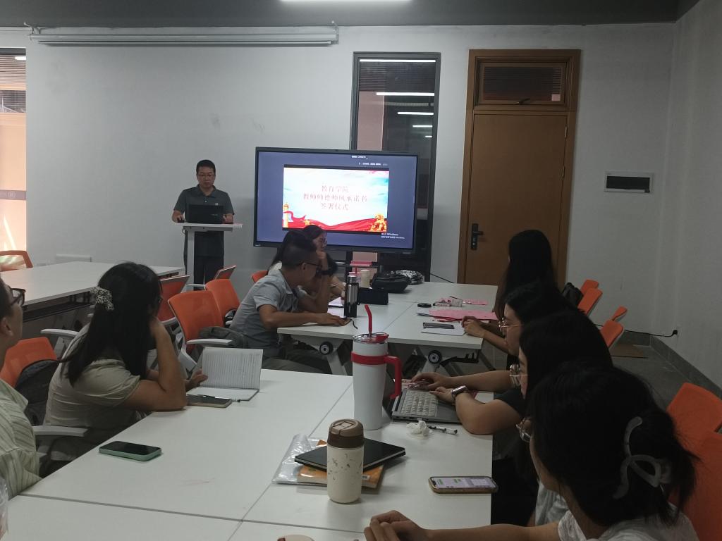 为深入贯彻习近平总书记关于教育的重要论述,积极响应国家建设教育强国的宏伟蓝图,教育学院于9月27日隆重举办了2024年秋季学期师德师风学习会暨承诺书签署仪式,全体教职工出席本次活动。此次活动旨在进一步强化教师的职业道德观念,规范教育教学行为,激发教师队伍的自我提升动力,共同为培养德智体美劳全面发展的社会主义建设者和接班人奠定坚实基础,携手推进教育强国目标的实现。