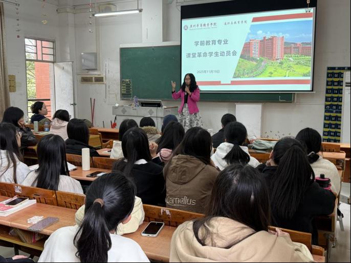 为推动学前教育专业课堂教学改革落地见效,强化实践育人成效,通识与教育学院于11月19日在博A301召开了学前教育专业课堂革命学生动员会。教学副院长陈少兰、课堂革命项目组负责人赵景阁及项目组教师成员和24级学前教育1班全体学生参加了会议。