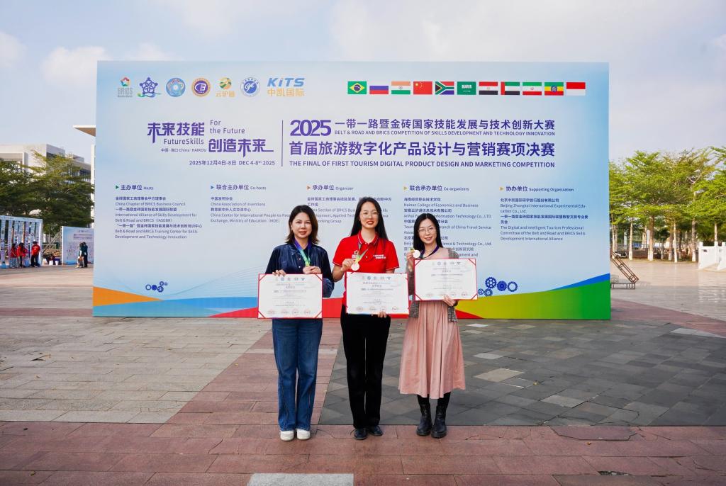 2025年12月5日,一带一路暨金砖国家技能发展与技术创新大赛之首届旅游数字化设计与营销赛项全国总决赛,在海南经贸职业技术学院盛大开幕。通识与教育学院教师汤素芹联同酒店管理与厨艺学院周期、林琳老师组成的参赛团队,历经半年精心备赛及南部赛区的激烈角逐成功晋级后,在本次全国总决赛中奋勇争先,最终斩获三等奖第一名的突破性成绩。