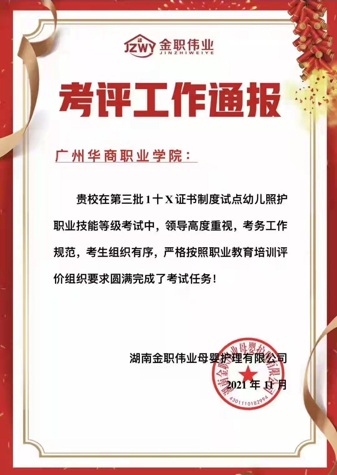 2021年11月27-28日,广州华商职业学院教育与艺术学院顺利通过1+X幼儿照护职业技能等级证书(中级)考试,并收到教育部认定的职业技能评价组织——湖南金职伟业母婴护理有限公司的考评工作通报。