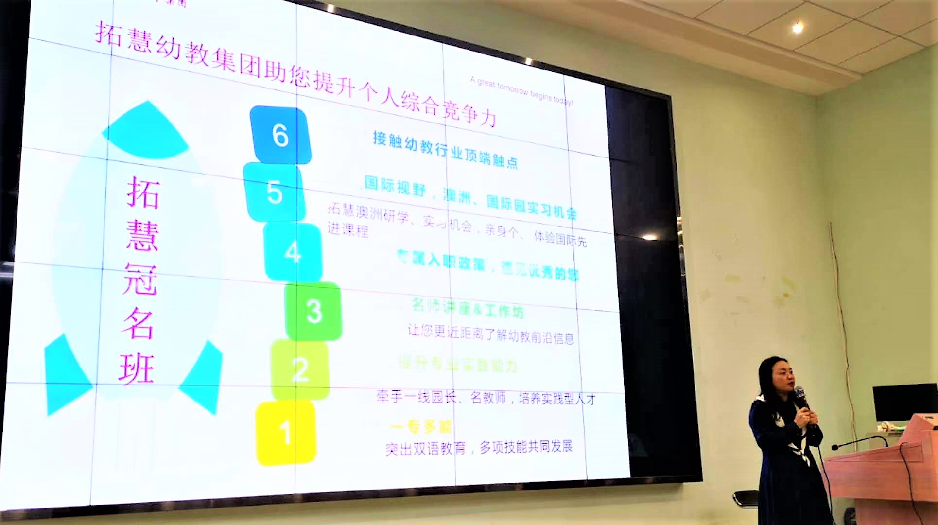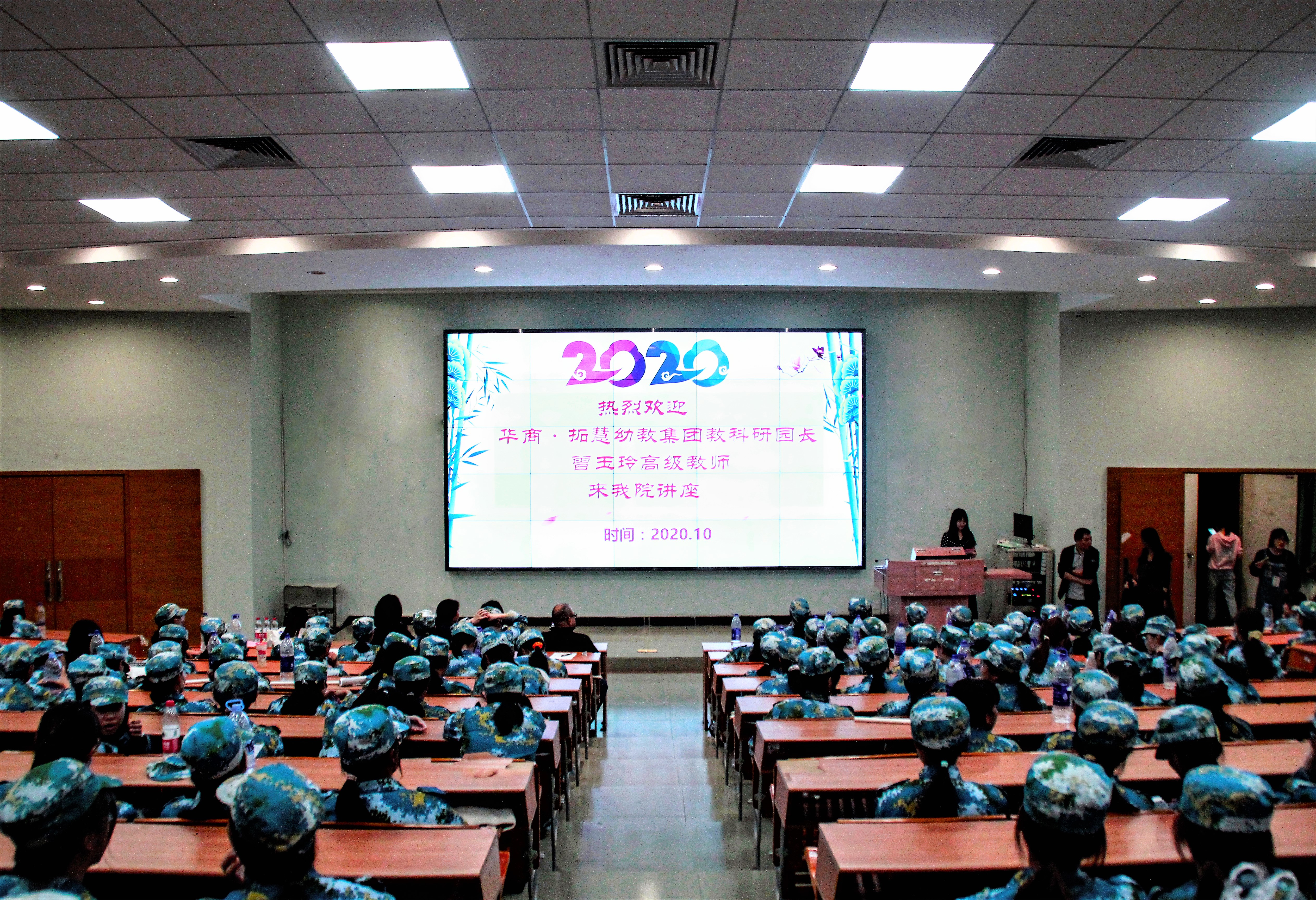 华商•拓慧幼教集团教科研园长、高级教师曾玉玲园长就拓慧冠名班组建进行了精彩的宣讲。她从幼儿教师的发展前景、华商•拓慧幼教集团基本情况、华商•拓慧幼教集团幼儿教育理念和教师再培养等四个方面做了介绍。宣讲内容趣味生动,在2020级学前教育专业新生中产生强烈的反响。