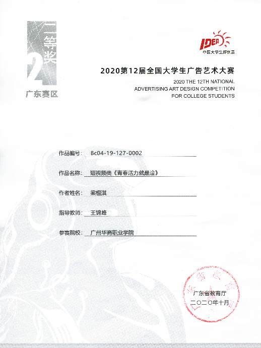 全国大学生广告艺术大赛是由教育部高等教育司指导,中国高等教育学会及教育部高等学校新闻传播学类专业教学指导委员会主办,全国大学生广告艺术大赛组委会组织,中国传媒大学、大广赛文化传播(北京)有限公司承办的全国高校文科大赛。本届大广赛广东省赛区共收到参赛作品13000余件,参赛院校100所(183个院系),我院学子脱颖而出,获得两个二等奖,一个三等奖,获奖情况如下:
