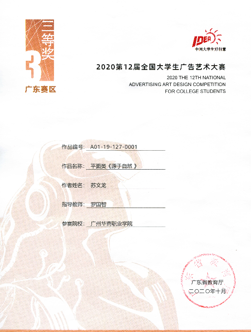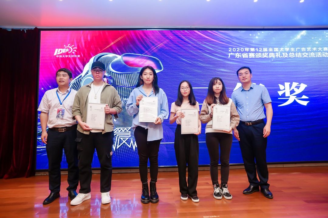 2020年第十二届全国大学生广告艺术大赛广东赛区颁奖交流会,于2020年11月20日9时在广州大学城中心酒店举行,我院赵岩峰副院长带队、比赛指导老师蔡筱斌、获奖学生18级艺术设计2班 朱嘉哲、苏文龙、19级艺术设计2班 梁榅淇参加了领奖。