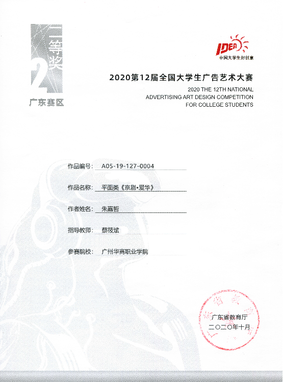 全国赛区优秀奖、广东省赛区二等奖 平面类《京剧•爱华》朱嘉哲作品 蔡筱斌 指导