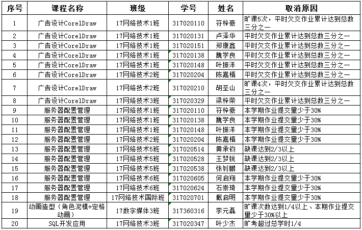 根据《广州华商职业学院学生学籍管理办法》(华商职教〔2017〕60号)第三章第二十一条“旷课累计达到该课程教学总时数四分之一者或平时欠交作业或不参加实验累计达到总数三分之一者取消考核资格”之规定,经学生所在单位核查,学院教务处审核,同意取消符梓豪等二十位同学本学期相应课程的期末考核资格(具体见附表)。