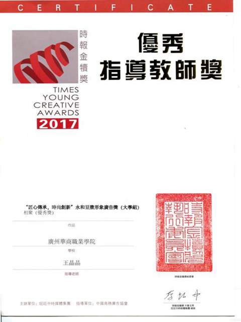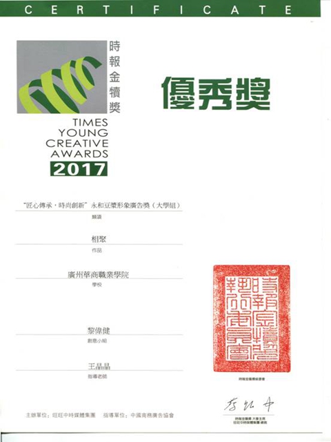 2、作为黎伟健的指导老师,学生设计系列作品《永和豆浆-平面海报设计》在《第26届时报金犊奖“匠心传承,时尚创新”永和豆浆形象广告类(大学组)》中获国家级优秀奖,教师获得优秀指导教师奖。