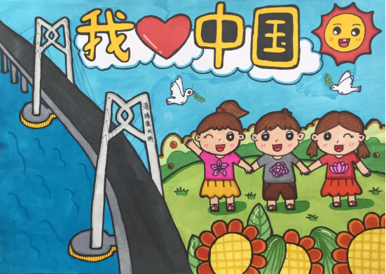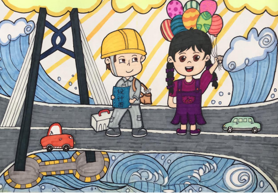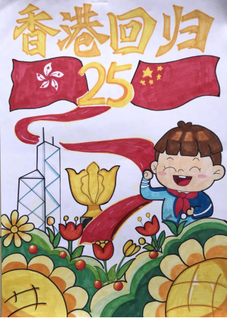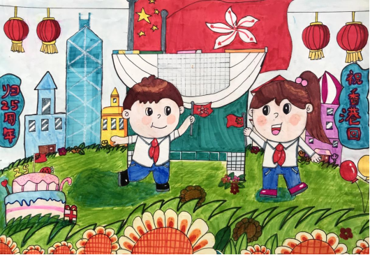 作品中运用紫荆花、气球、香港中银大厦、鲜花、生日蛋糕、中国国旗、香港区旗、港珠澳大桥等元素,通过绘画表达了香港回归25周年的节日气氛和人们共同庆祝的喜悦心情,同学们结合专业优势为节日献礼。
