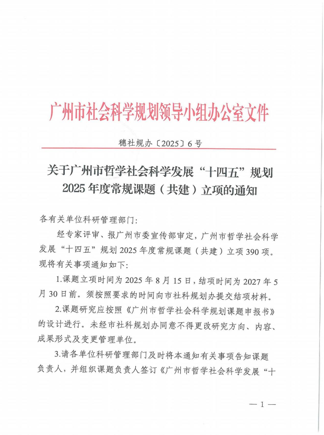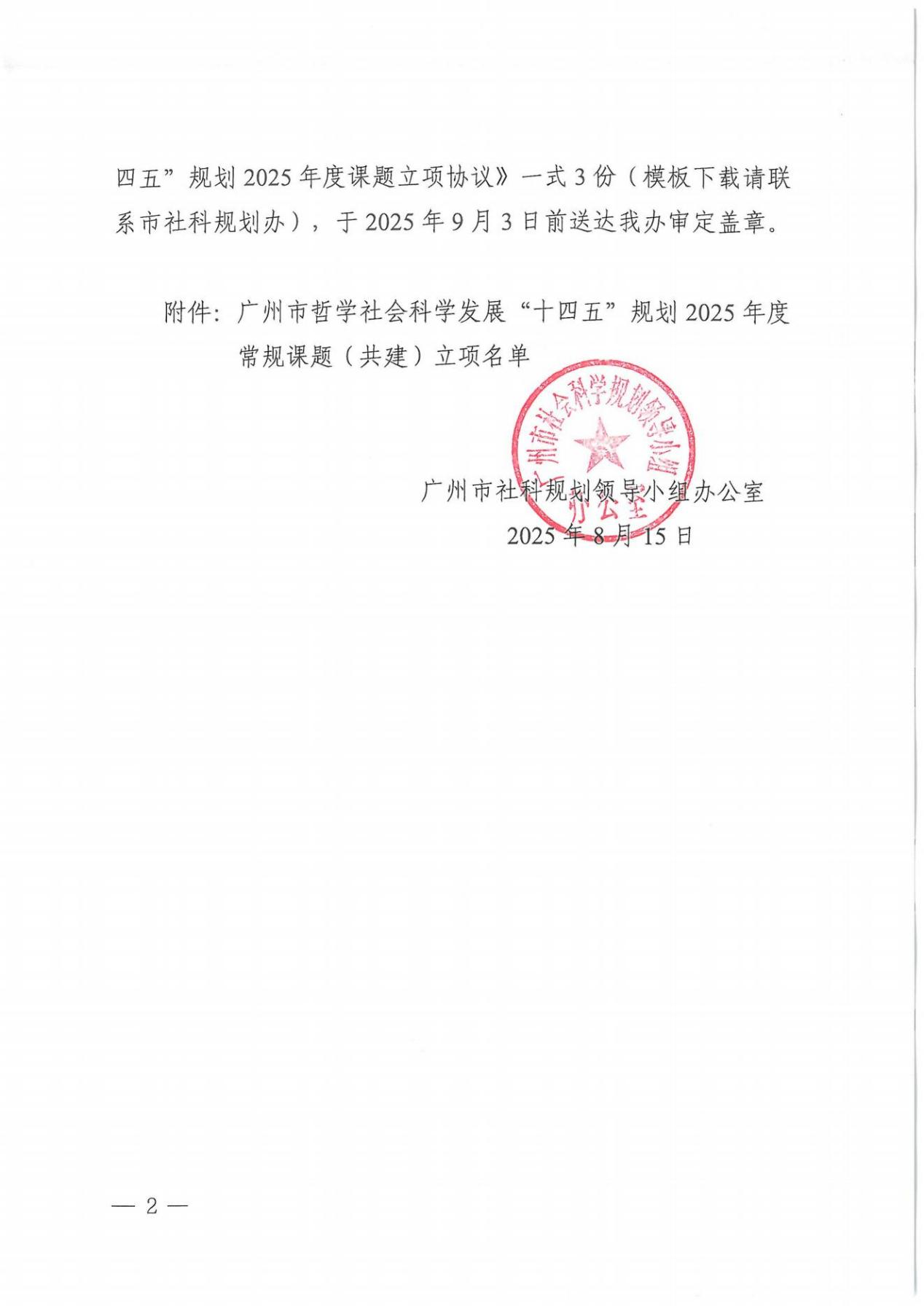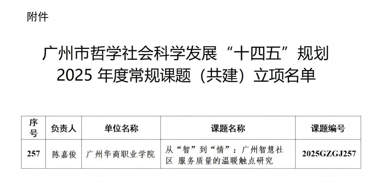 8月15日,根据《关于广州市哲学社会科学发展“十四五”规划2025年度常规课题立项的通知》(穗社规办〔2025〕6号)文件,教育学院陈嘉俊老师申报的共建课题《从“智”到“情”:广州智慧社区服务质量的温暖触点研究》成功获批(课题编号:2025GZGJ257)。