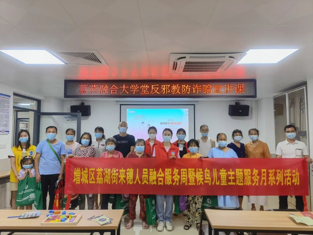 6月25日早上9:00,教师党员沈锶佩老师、学生党员志愿者容子淋、禤秋怡同学到达清燕社区综合文化服务中心。协助由广州市增城区反邪教协会、广州华商职业学院教育与艺术学院党总支共同开展荔燕融合大学堂反邪教防诈骗专题课堂,吸引众多来穗人员及子女到场参与学习,课堂上通过案例分析、互动交流等方式,进一步提升来穗人员的反邪教防诈骗的安全防范意识。
