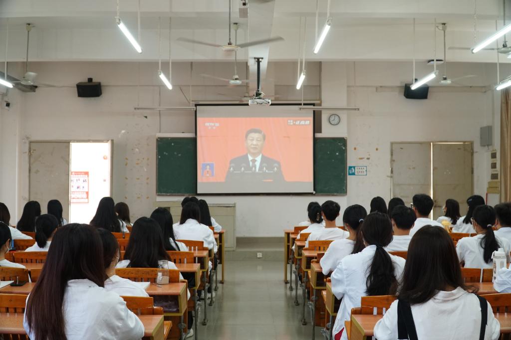 我院学生党员、党务组成员在课室集中观看直播会议,同学们以饱满的精神面貌来迎接此次重要的会议,大家认真聆听了习近平总书记的报告,切实感受到新时代十年的伟大变革,让我们在新征程上备受鼓舞,信心倍增。