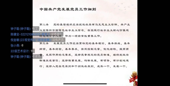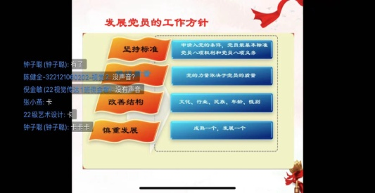 第二讲由教育与艺术学院党总支副书记陆孟彤老师讲解, 她以“发展党员的方针”、“发展党员的原则”、“发展党员的流程”三个方面为同学们讲述了成为一名中国共产党员的流程。告诉学员要端正入党动机,提高自身的思想觉悟,全方面提升自己,从思想和行为上入党,同时鼓励学员要在日常生活中保持自律,在学习工作中更加积极上进,以更高的标准要求自身。