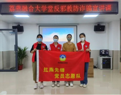 6月25日早上9:00,教师党员沈锶佩老师、学生党员志愿者容子淋、禤秋怡同学到达清燕社区综合文化服务中心。协助由广州市增城区反邪教协会、广州华商职业学院教育与艺术学院党总支共同开展荔燕融合大学堂反邪教防诈骗专题课堂,吸引众多来穗人员及子女到场参与学习,课堂上通过案例分析、互动交流等方式,进一步提升来穗人员的反邪教防诈骗的安全防范意识。