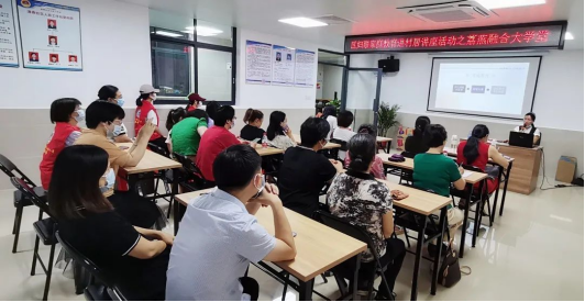 6月26日上午,我院学生党员钟秋延、王晓诗协助荔湖街综合服务中心(来穗组)、荔燕融合家园开展荔燕融合大学堂父母课堂,以“学做智慧父母,点亮幸福人生”为主题,吸引了17对父母参与,在课堂中引导来穗家长树立正确的教育观,学习如何与孩子沟通等,进一步增强来穗亲子家庭与本地家庭的互动,从而更好地融入家庭、融入社区,让来穗家庭得到更多共同学习的机会。