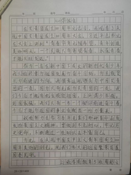 青年一代是民族的希望,是国家的栋梁,肩负着祖国建设的重担,而中国共青团则是中国青年的先锋组织,是中国共产党的预备役,生力军,也同样是党的助手和后备军。共青团的任务和目标是培养“有理想,有道德,有文化,有纪律”的社会主义新人。我们有责任也有义务为中华民族的伟大复兴而忘我劳动,勤奋学习,开拓创新。