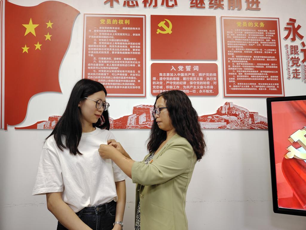 支部副书记赵景阁亲自为潘海凤同志佩戴党徽并在党旗面前进行了宣誓,赵景阁同志希望以后潘海凤同志能更加积极学习党的理论和路线方针政策,不断提高自己的思想政治素质和业务能力,为推动学校的发展、服务人民群众作出更大的贡献。