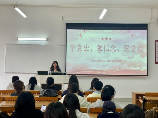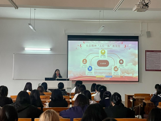 随后,梁老师以时间轴为脉络,梳理党史关键节点,串联成鲜活的“奋斗故事线”,深化学子对“中国共产党为什么能”的认知。在精神解读环节,她聚焦长征精神,通过军需处长舍己为人、红军战士翻雪山过草地等事迹,让抽象精神具象化。同时,梁老师将宏大使命与青年责任相连,指出学业钻研、集体奉献等都是践行初心的具体体现,并提议学予以研读党史著作、参与红色志愿活动等行动落实学习成果。