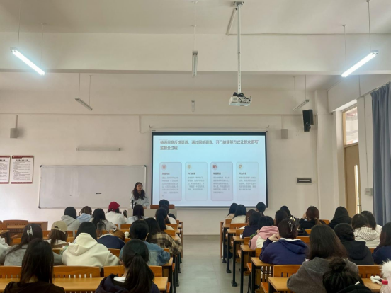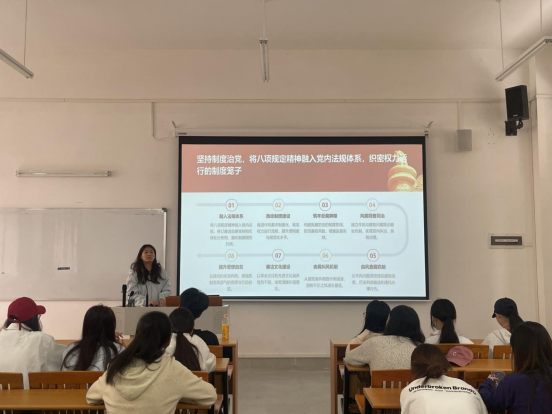 讲解过程中,梁丽宁将理论阐释与案例分析相结合,内容兼具理论深度与实践价值。台下同学专注聆听,现场学习氛围浓厚。同学们纷纷表示,通过本次党课,不仅对中央八项规定精神有了更系统的理解,更对作风纪律的重要性有了深刻认知,为今后树立正确价值观、严守作风底线筑牢了思想基础。