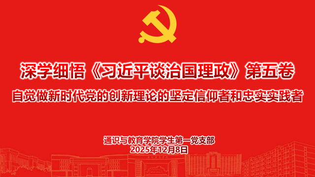 为推动党的创新理论入脑入心,引导青年党员坚定理想信念、强化使命担当,2025年12月8日,通识与教育学院学生第一党支部开展书记讲党课专题活动。支部书记王嘉诚带领25名党员,围绕“深学细悟《习近平谈治国理政》第五卷 自觉做新时代党的创新理论的坚定信仰者和忠实实践者”主题,开展沉浸式理论学习。