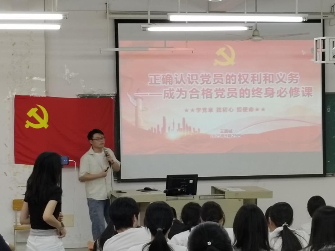 为深入学习贯彻《中国共产党章程》,强化学生党员党性修养,引导入党积极分子端正入党动机,切实掌握党员权利与义务的核心内涵,9月25日,学院学生第一党支部组织开展专题党课学习。党支部书记王嘉诚以《正确认识党员的权利和义务——成为合格党员的终身必修课》为题,为支部全体党员、入党积极分子讲授党课。