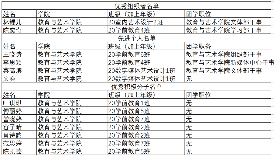 在此次雷锋志愿者服务月中,教育与艺术学院一共有十三名同学获得奖项,分别为优秀组织者两位、先进个人四位、优秀积极分子七位。