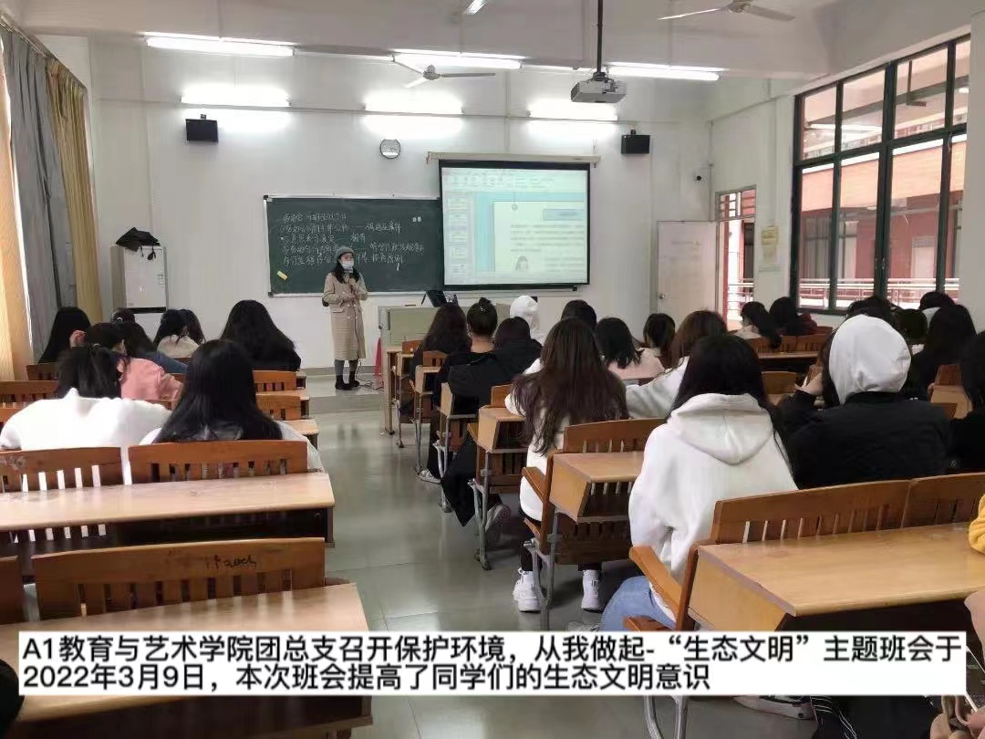 为深入贯彻党的十九大精神和“创新、协调、绿色、开放、共享”发展理念,在学生中普及生态文明知识,倡导生态文明理念,使全院师生成为建设生态文明的自觉实践者。 教育与艺术学院于2022年3月9日安排所有班级召开了“生态文明”主题班会,通过班会教育让学生认识到人类只有一个地球,保护地球的生态环境就是保护我们人类自身。教育学生要积极投身环保活动,增强学生的生态环境保护意识;同时,教育学生从身边做起,自觉主动地去保护校园环境,做文明大学生。