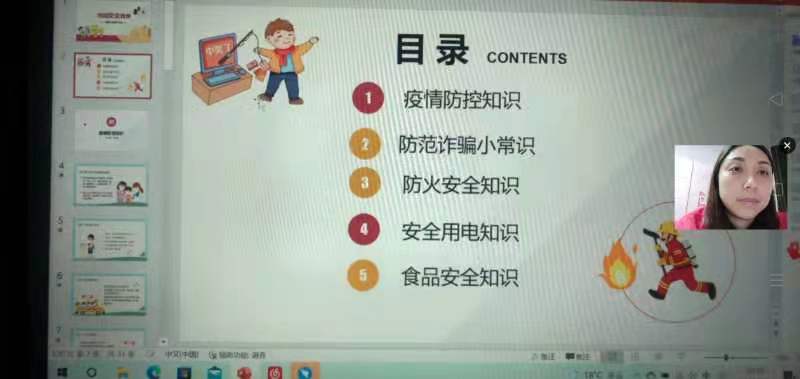 内容中提到同学们外出上课是佩戴口罩,宿舍内勤通风,个人要勤洗手。身体出现异常状况要及时就医。防范诈骗的十个“凡是”。遇见火警灾情如何逃生,例如迅速撤离法,到新地点要留意疏散指示标志。食品的辨别方法四大内容。