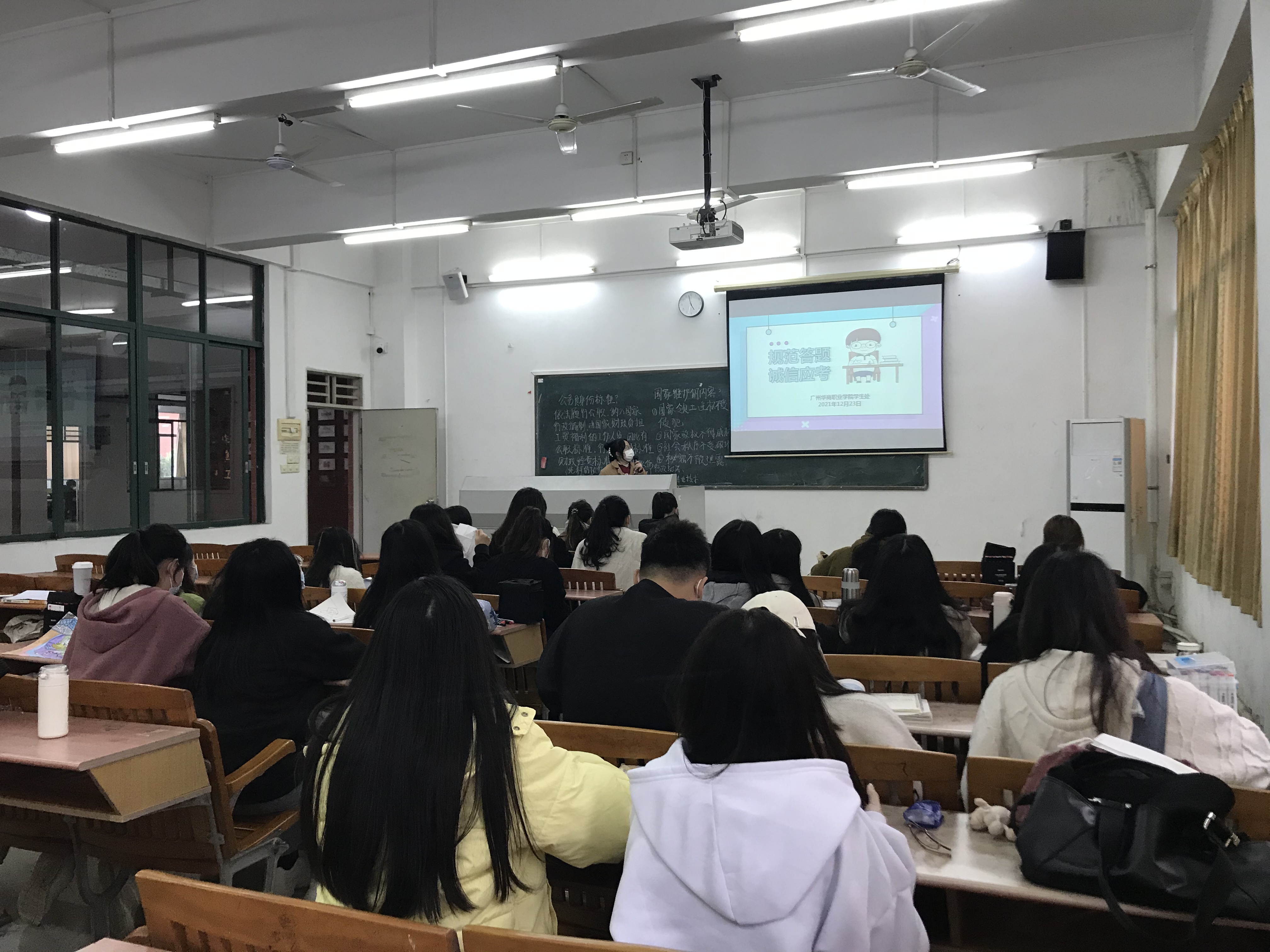 12月26日召开了规范答题,诚信考试主题班会,首先由班主任上台发言,讲述了这一学期以来,班级整体的情况是非常好的,各课任老师反应每位同学上课都很认真,学习都有进步。但也特别强调期末考试一定要诚信考试,不要出现作弊现象!最近也出现了许多诈骗情况,大家要提高警惕,最后祝大家考试顺利。然后由班长再次进行诚信考试等一些注意事项。最后进行集体大合照。