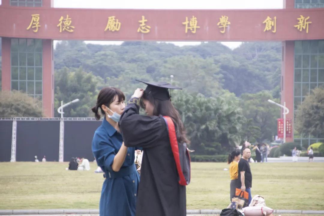 即将要在这个秋季和学校告别,并暂别学生时代。青春散落,情谊仍在,同学们之间相互整理学士帽并合影留念,好好和学校道别,将在学校的时光珍藏为回忆。