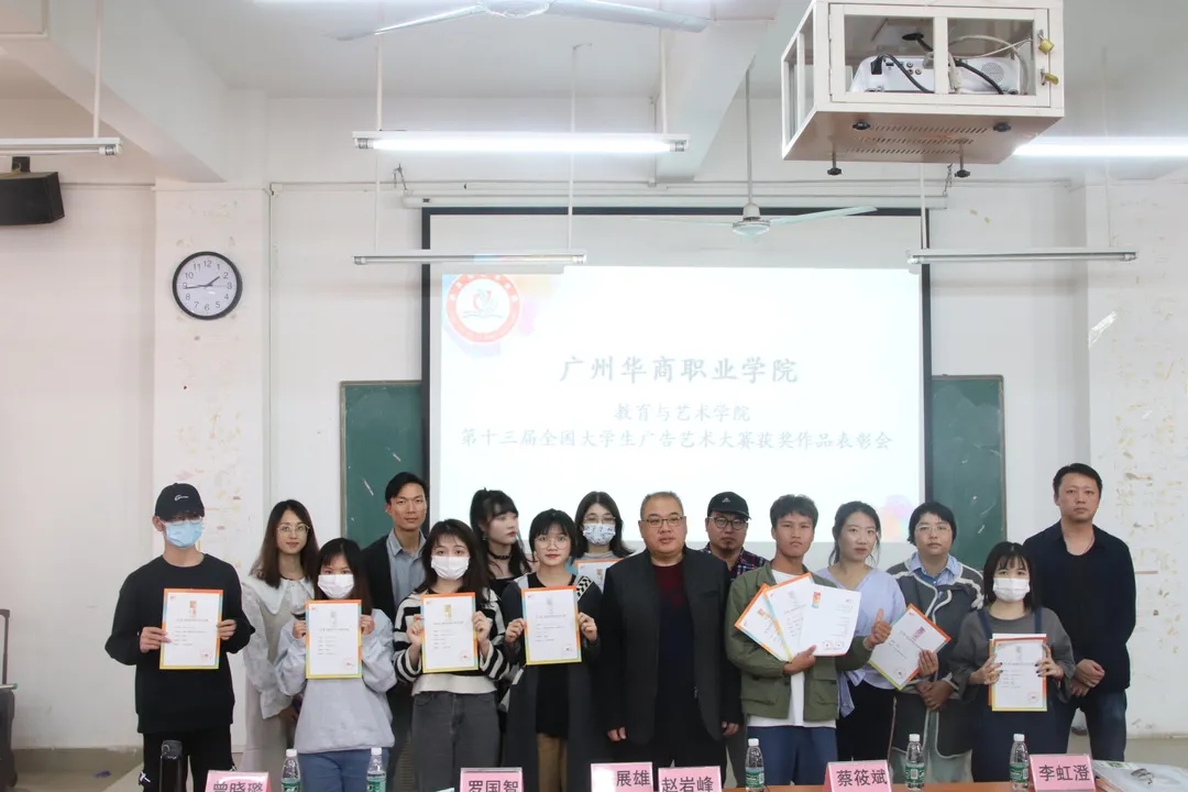 2021年12月10日中午12:30我院在博学楼c301开展第十三届全国大学生广告艺术大赛获奖作品表彰大会。出席本次大会的领导老师有:教育与艺术学院教学院长赵岩峰、视觉传达设计专业负责人罗国智老师、数字媒体艺术设计专业负责人陈展雄老师、艺术设计专业负责人蔡筱斌老师、曾晓璐老师、彭亚珍老师和李虹澄老师。