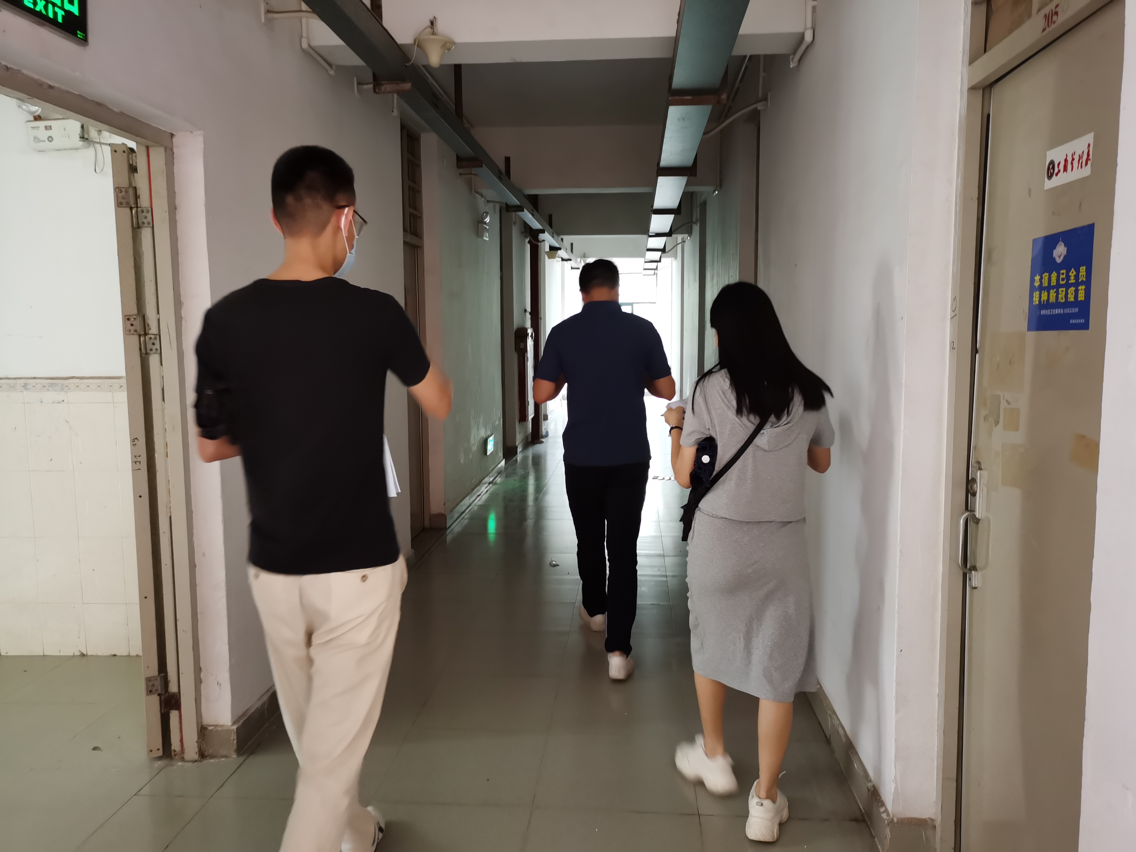 罗琦琪书记首先对尚未离校学生寝室的情况进行了了解,并叮嘱同学们一定要注意离校安全。同时,辅导员仔细排查学生宿舍安全隐患,对宿舍门窗是否锁好、水电是否关闭、阳台和走廊栏杆有无危险易坠物进行逐一检查。经过近一个小时的精心检查,各宿舍卫生状况普遍良好,基本做到了宿舍整体干净整洁,用电合理、安全,但仍有少数宿舍存在卫生死角和安全隐患。