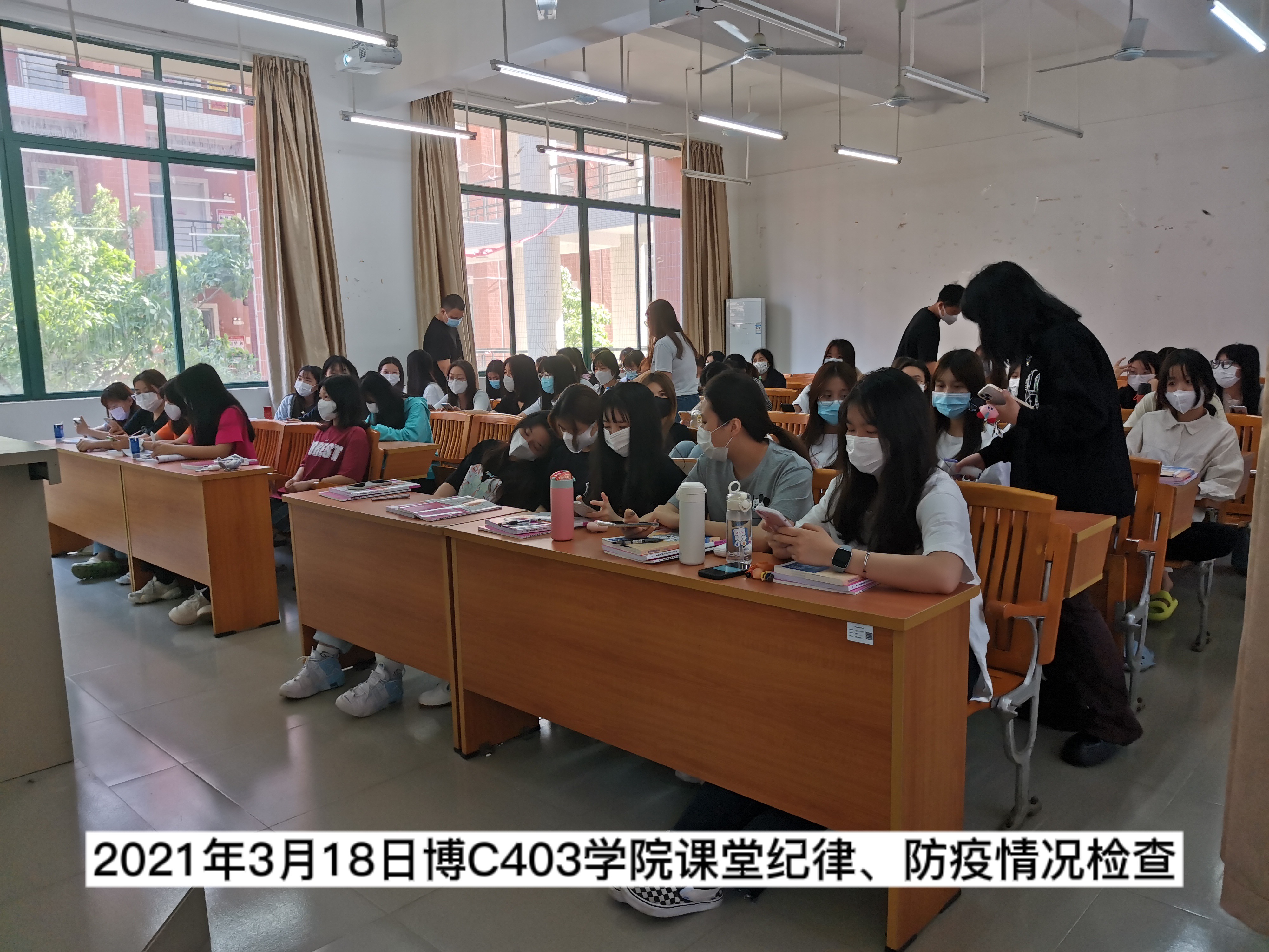 2021年4月10日为落实我校防疫相关政策,我院团总支协调各班班委组成防疫防诈小组,对我院全体班级进行定期检查。由学院防疫工作检查小组,对学院各班的上课的疫情防控工作进行检查。