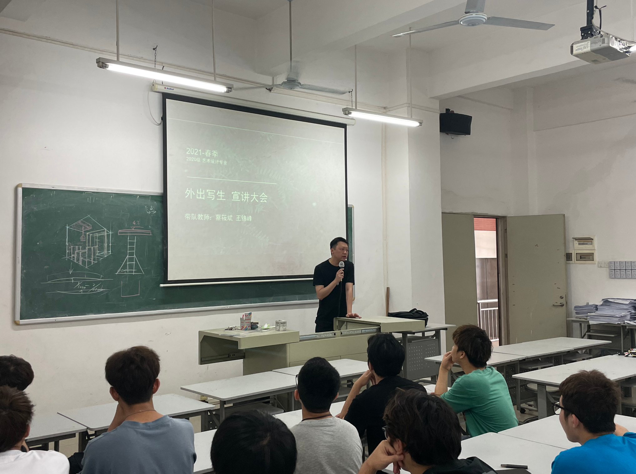 会议开始,蔡筱斌老师老师、蒋锦宏老师与1班同学交流了解了班里近期情况,然后进行了这学期的相关的专业方向课交流,以及即将进行的外出写生课程,讲解了写生课程外出地点,准备事项,安全问题和课程需要完成的作品类型数量。